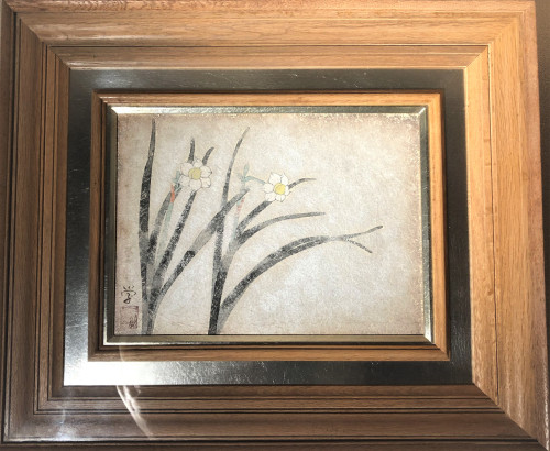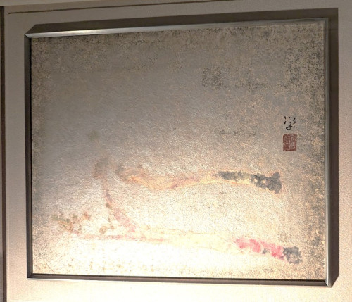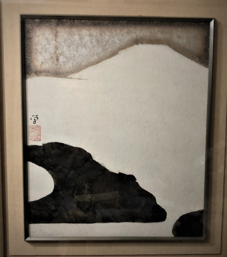 白富士のむこう側では激しく雪が降っている。雪は銀泥で描かれているので、まなぶが亡くなって44年経っているにもかかわらず銀が黒変して絵に深みが出てきた。天国にいるまなぶが今でも絵筆を振るっているかのように。